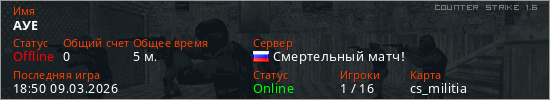 Играет на Counter Strike 1.6 сервере. Страна: РоссияПервый раз замечен 18:43 09.03.2026