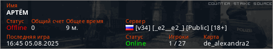 Играет на Counter Strike Source сервере. Страна: РоссияПервый раз замечен 18:20 09.04.2025