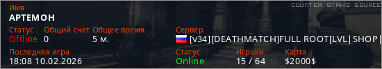 Играет на Counter Strike Source сервере. Страна: РоссияПервый раз замечен 17:39 10.02.2026