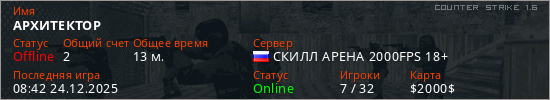 Играет на Counter Strike 1.6 сервере. Страна: РоссияПервый раз замечен 09:55 17.11.2025
