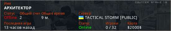 Играет на Counter Strike 1.6 сервере. Страна: УкраинаПервый раз замечен 18:46 16.02.2026
