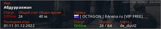 Играет на Counter Strike Source сервере. Страна: РоссияПервый раз замечен 00:33 31.12.2022
