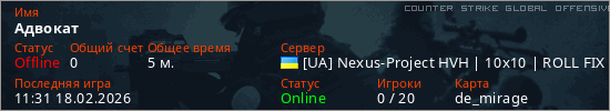 Играет на Counter Strike Global Offensive сервере. Страна: УкраинаПервый раз замечен 11:12 18.02.2026