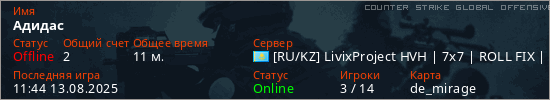 Играет на Counter Strike Global Offensive сервере. Страна: КазахстанПервый раз замечен 11:10 07.08.2025