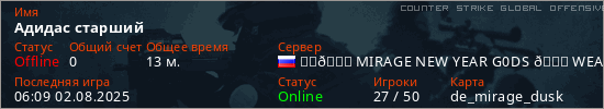 Играет на Counter Strike Global Offensive сервере. Страна: РоссияПервый раз замечен 04:24 02.08.2025