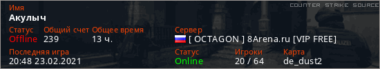 Играет на Counter Strike Source сервере. Страна: РоссияПервый раз замечен 21:55 08.07.2020