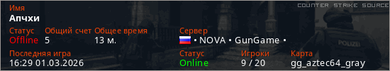 Играет на Counter Strike Source сервере. Страна: РоссияПервый раз замечен 10:20 28.02.2026