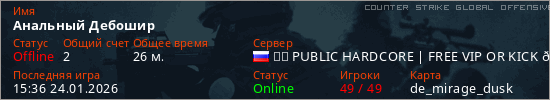 Играет на Counter Strike Global Offensive сервере. Страна: РоссияПервый раз замечен 11:24 21.05.2025