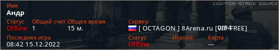 Играет на Counter Strike Source сервере. Страна: РоссияПервый раз замечен 08:29 15.12.2022