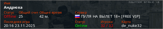 Последний раз был в сети 20:16 23.11.2025 Игрок с таким ником замечен на 32 серверах