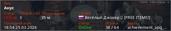 Играет на Team Fortress 2 сервере. Страна: РоссияПервый раз замечен 09:19 15.03.2026