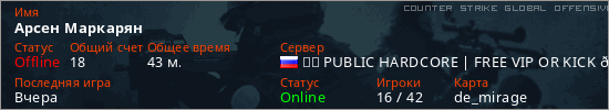 Играет на Counter Strike Global Offensive сервере. Страна: РоссияПервый раз замечен 18:43 09.02.2026