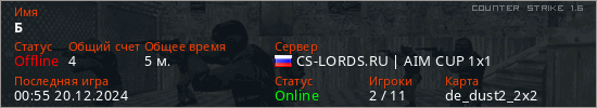 Играет на Counter Strike 1.6 сервере. Страна: РоссияПервый раз замечен 00:49 20.12.2024