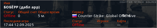 Играет на Counter Strike Source сервере. Страна: РоссияПервый раз замечен 17:30 12.09.2025