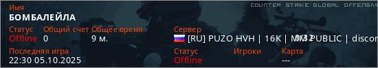 Играет на Counter Strike Global Offensive сервере. Страна: РоссияПервый раз замечен 22:14 01.10.2025
