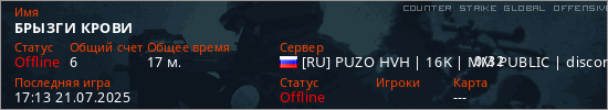 Играет на Counter Strike Global Offensive сервере. Страна: РоссияПервый раз замечен 12:14 19.07.2025