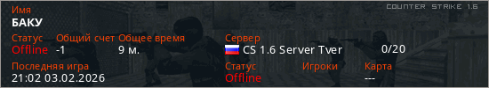 Играет на Counter Strike 1.6 сервере. Страна: РоссияПервый раз замечен 20:37 03.02.2026