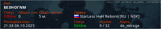 Играет на Counter Strike Global Offensive сервере. Страна: РоссияПервый раз замечен 21:34 06.10.2025
