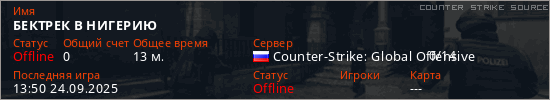 Играет на Counter Strike Source сервере. Страна: РоссияПервый раз замечен 20:42 13.09.2025