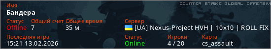 Играет на Counter Strike Global Offensive сервере. Страна: УкраинаПервый раз замечен 17:10 09.02.2026