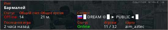 Играет на Counter Strike 1.6 сервере. Страна: РоссияПервый раз замечен 17:13 29.03.2026