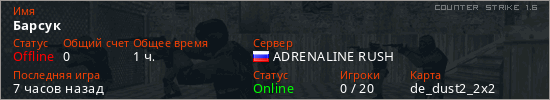 Играет на Counter Strike 1.6 сервере. Страна: РоссияПервый раз замечен 09:25 23.02.2026