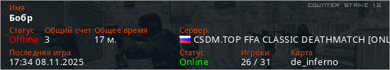 Последний раз был в сети 17:34 08.11.2025 Игрок с таким ником замечен на 14 серверах