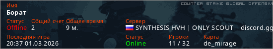 Играет на Counter Strike Global Offensive сервере. Страна: РоссияПервый раз замечен 12:08 23.02.2026