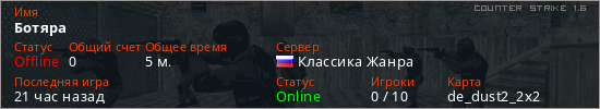 Играет на Counter Strike 1.6 сервере. Страна: РоссияПервый раз замечен 21:30 28.02.2026