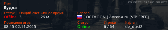 Играет на Counter Strike Source сервере. Страна: РоссияПервый раз замечен 10:03 26.10.2025