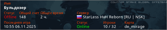 Играет на Counter Strike Global Offensive сервере. Страна: РоссияПервый раз замечен 18:13 22.10.2025