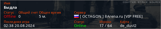 Играет на Counter Strike Source сервере. Страна: РоссияПервый раз замечен 02:32 20.08.2024