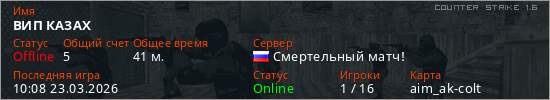 Играет на Counter Strike 1.6 сервере. Страна: РоссияПервый раз замечен 20:00 19.03.2026