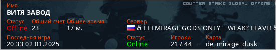Играет на Counter Strike Global Offensive сервере. Страна: РоссияПервый раз замечен 14:25 02.01.2025