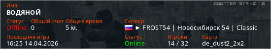 Играет на Counter Strike 1.6 сервере. Страна: РоссияПервый раз замечен 16:20 14.04.2026
