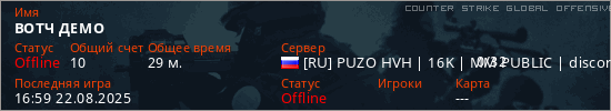 Играет на Counter Strike Global Offensive сервере. Страна: РоссияПервый раз замечен 20:09 20.08.2025