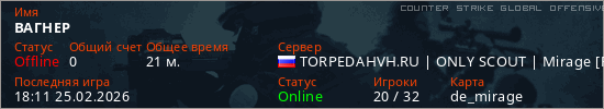 Играет на Counter Strike Global Offensive сервере. Страна: РоссияПервый раз замечен 06:05 25.02.2026