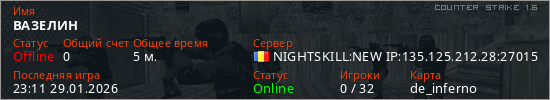 Последний раз был в сети 23:11 29.01.2026 Игрок с таким ником замечен на 7 серверах