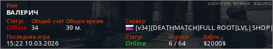 Играет на Counter Strike Source сервере. Страна: РоссияПервый раз замечен 13:46 22.02.2026