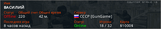 Играет на Counter Strike 1.6 сервере. Страна: РоссияПервый раз замечен 18:54 04.04.2026