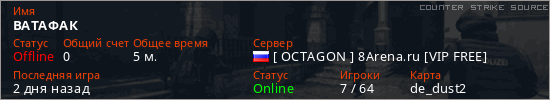 Играет на Counter Strike Source сервере. Страна: РоссияПервый раз замечен 22:39 15.01.2026