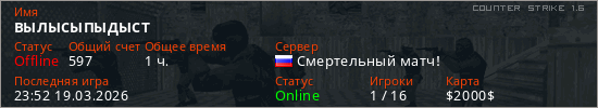 Играет на Counter Strike 1.6 сервере. Страна: РоссияПервый раз замечен 21:49 17.03.2026