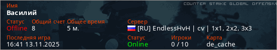 Играет на Counter Strike Global Offensive сервере. Страна: РоссияПервый раз замечен 15:55 13.11.2025