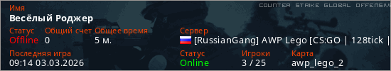 Играет на Counter Strike Global Offensive сервере. Страна: РоссияПервый раз замечен 08:53 03.03.2026