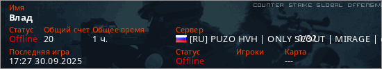 Играет на Counter Strike Global Offensive сервере. Страна: РоссияПервый раз замечен 08:30 24.09.2025