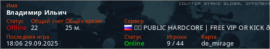 Играет на Counter Strike Global Offensive сервере. Страна: РоссияПервый раз замечен 19:29 27.09.2025