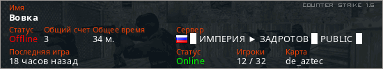 Играет на Counter Strike 1.6 сервере. Страна: РоссияПервый раз замечен 10:40 12.03.2026
