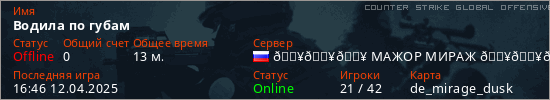 Играет на Counter Strike Global Offensive сервере. Страна: РоссияПервый раз замечен 03:02 07.03.2025