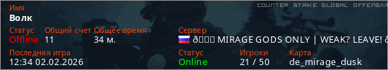 Играет на Counter Strike Global Offensive сервере. Страна: РоссияПервый раз замечен 03:40 23.11.2025
