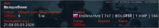 Играет на Counter Strike Global Offensive сервере. Страна: РоссияПервый раз замечен 21:02 05.03.2026
